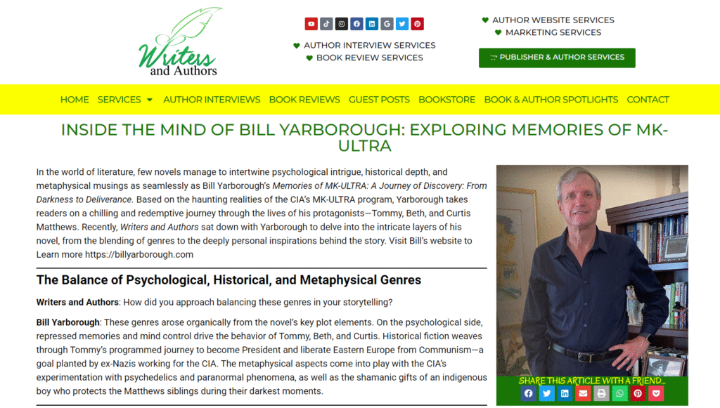 《暗黑破坏神公报》杂志刊登了一系列关于比尔童年在MK-ULTRA项目中经历的文章。以下是大卫·金和比尔·亚伯勒撰写的第四篇文章。 克莱顿的比尔·亚伯勒成年后生活顺利,先后在一家大型会计师事务所工作,之后进入金融行业。他曾担任两家非营利组织的总裁,目前正专注于创作他的系列小说中的第一部。虽然是虚构作品,但其灵感源自现实生活中那些非同寻常的经历。 在《暗黑破坏神公报》的九月、十月和十一月刊中,比尔回忆了他四岁时与弟弟和姐姐一起经历的那段经历,当时他认为自己参与了中央情报局臭名昭著的MK-ULTRA项目。他还描述了他们被压抑的记忆是如何被唤醒的,他随后的疗愈历程,以及他对一位来自萨满部落的墨西哥男孩的真挚回忆,正是这位男孩帮助比尔在项目中度过了痛苦的时光。 MK-ULTRA 是美国中央情报局在 20 世纪 50 年代至 60 年代初实施的一项秘密精神控制计划。1974 年 12 月,《纽约时报》曝光了中情局的非法活动,引发了政府和新闻界的一系列调查,最终揭露了 MK-ULTRA 的真面目。 该秘密计划的实验对象包括成年人、大学生和儿童。比尔和他的兄弟姐妹花了 30 年时间才打开了被压抑记忆的潘多拉魔盒,这场觉醒始于 20 […]